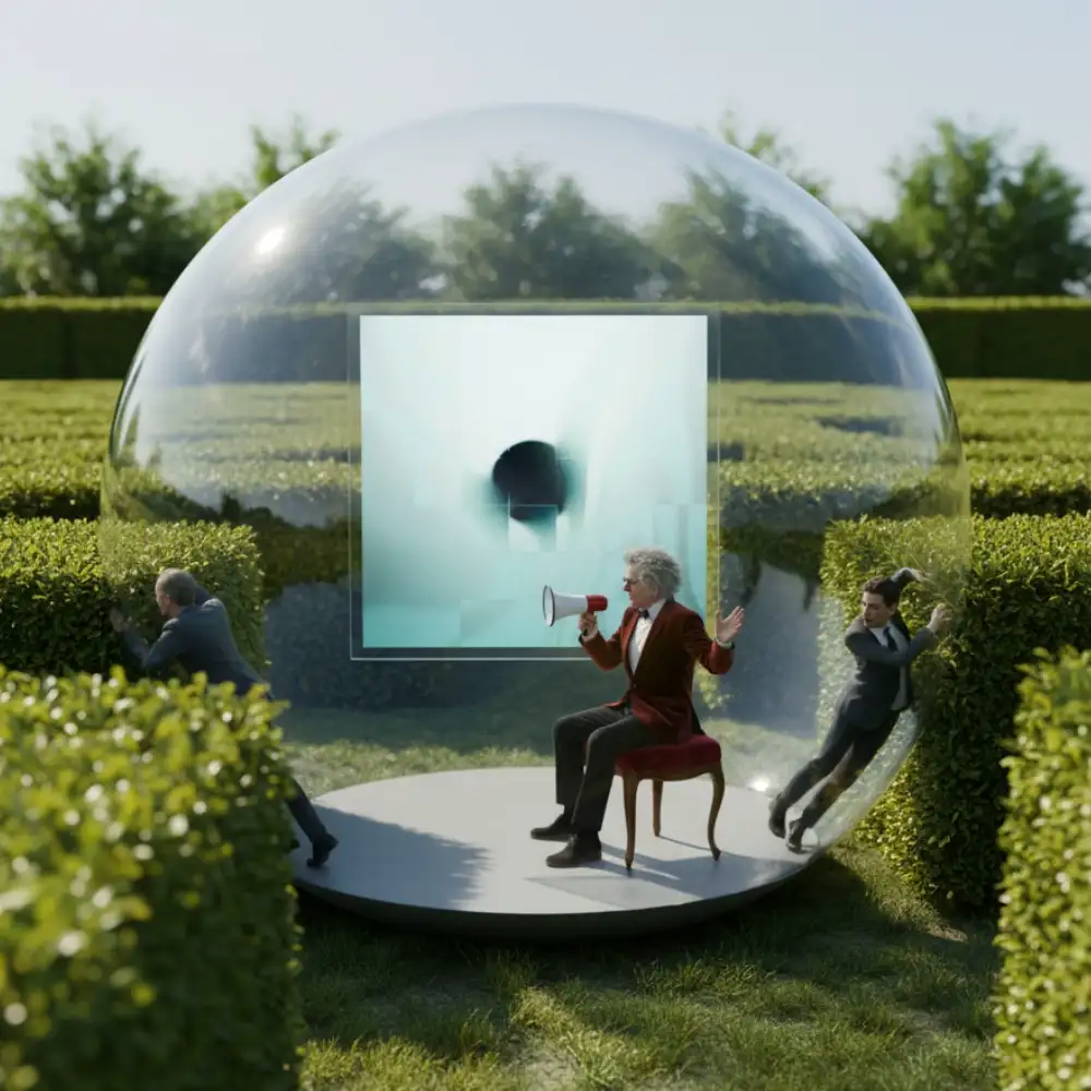 The grid is comforting because it repeats. It also distracts. Tile by tile, the surface keeps you occupied with small changes while the sphere waits behind it. This is the habit loop made visible: busy foreground, unresolved background. The composition invites you to choose where to look and to notice how quickly attention prefers the moving pattern over the still thing that matters.